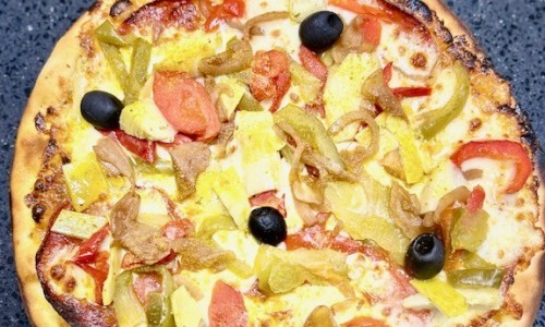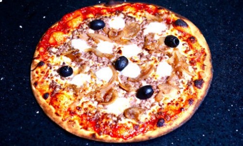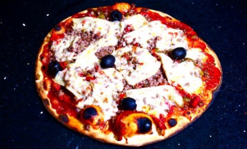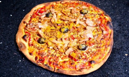 Tomate, mozzarella, viande hachée, oignons caramélisés, poivrons, curry, crème fraîche