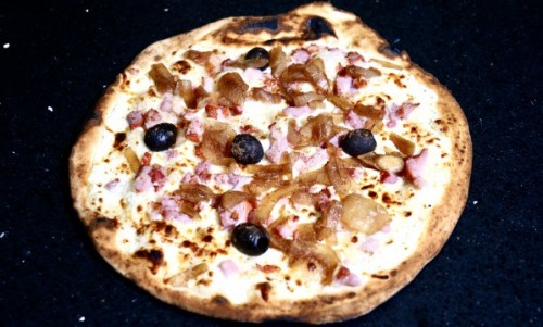 Tomate, mozzarella, lardons, oignons caramélisés, crème fraîche
