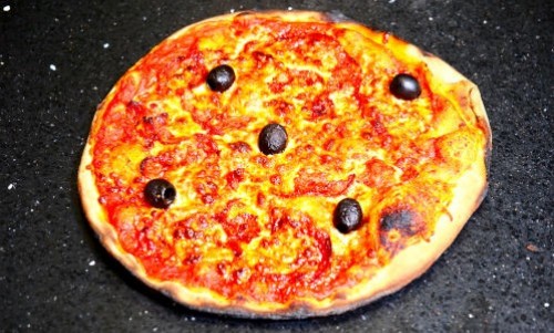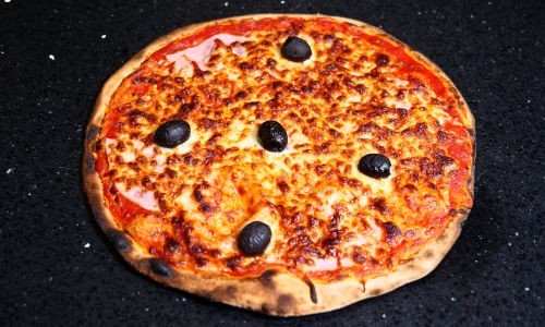 Toutes nos pizzas sont garnies d'olives et découpées en parts.