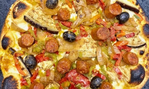 Sauce andalouse, mozarella, chorizo fort, poivrons, artichauts confits, oignons caramélisés, curcuma