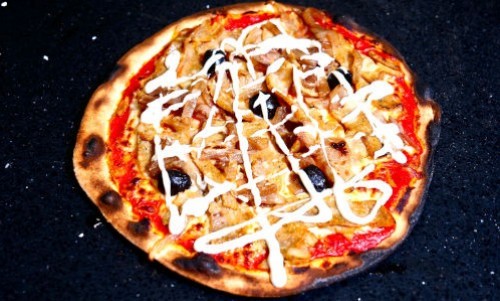 Tomate, mozzarella, kebab, crème fraîche, oignons caramélisés, sauce kebab